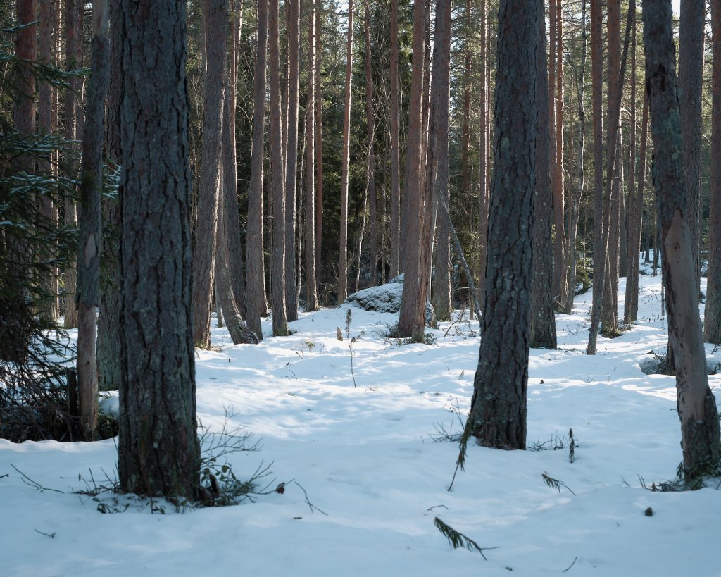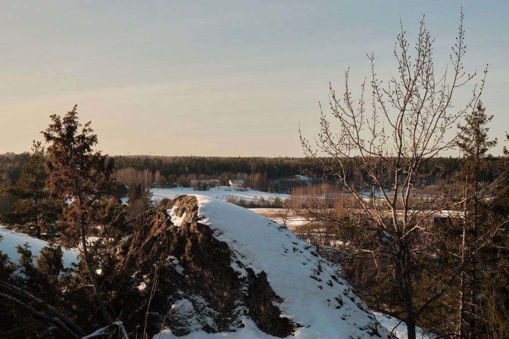 Högberget is a small hill in southern Sipoonkorpi. The top has some small cliffs and boulder but is mostly very flat and covered with trees. The visibility from the hill is blocked by trees expect to the east towards the city of Vantaa. When I arrived there, the sun was just shining directly from east. In a normal picture from there, the ground would be just black if the sky was visible at all. I attempted to take a picture looking towards Vantaa from the hill and using the HDR setting on my camera, I did manage to take a picture where you can see the factories in Vantaa and (and/or maybe Helsinki) on the horizon with the sun shining directly towards the camera. I think it looks pretty disgusting but it’s also kind of cool that you can do that.