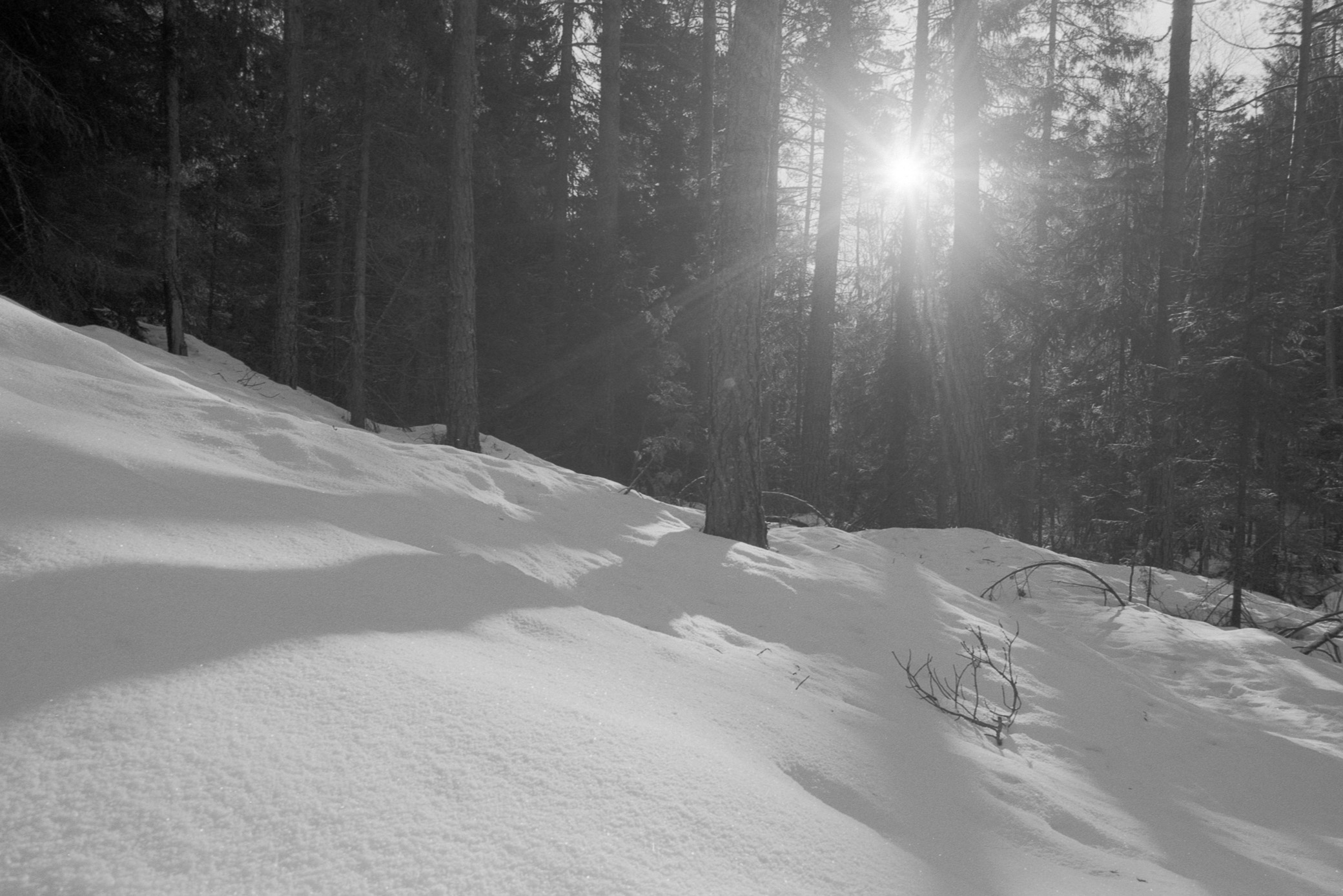 The Störträsk lake was frozen and the coast was covered in snow. Because the sun was shining from directly the other side of the lake, the contrast was high and I could only take pictures of the coast on my side.