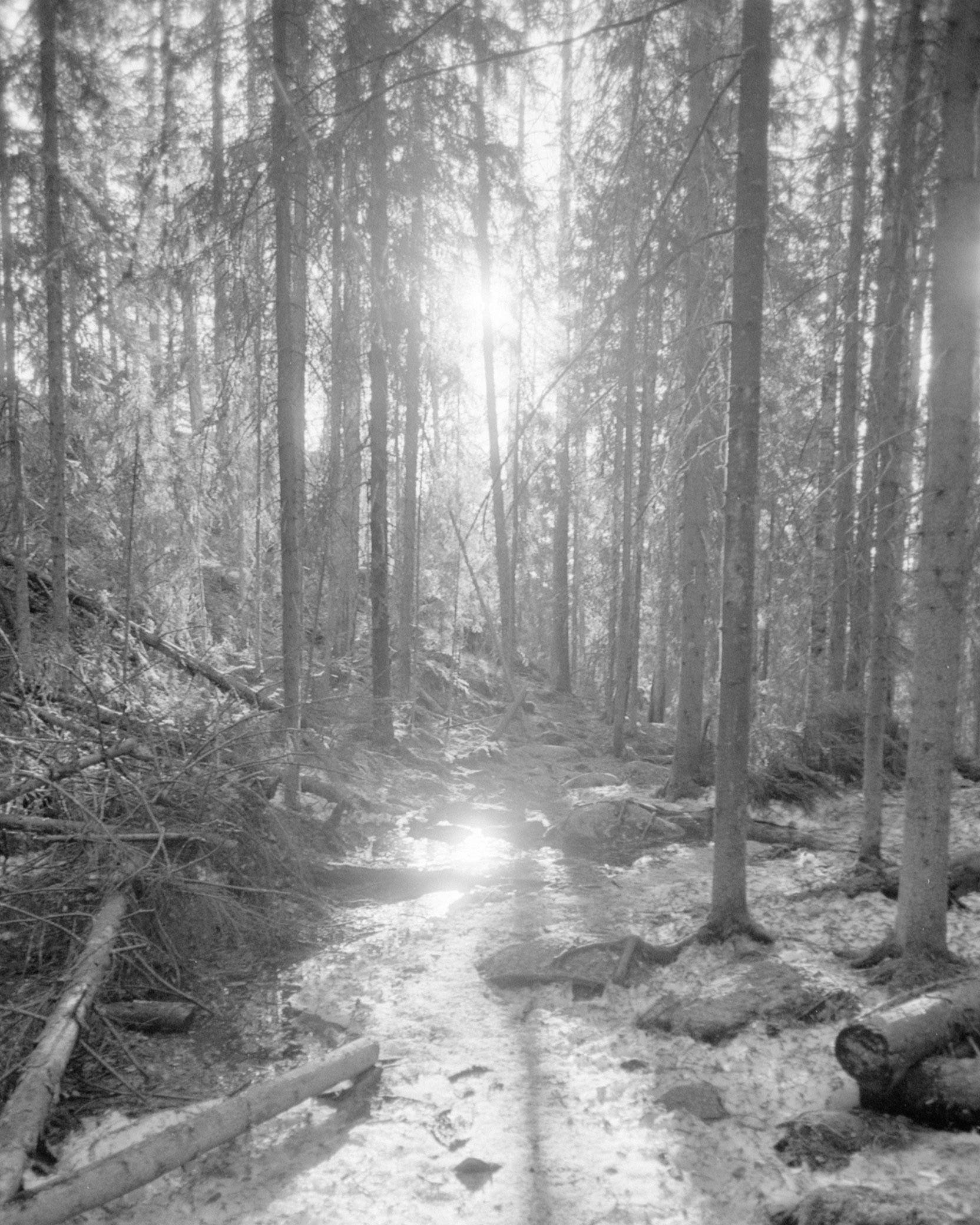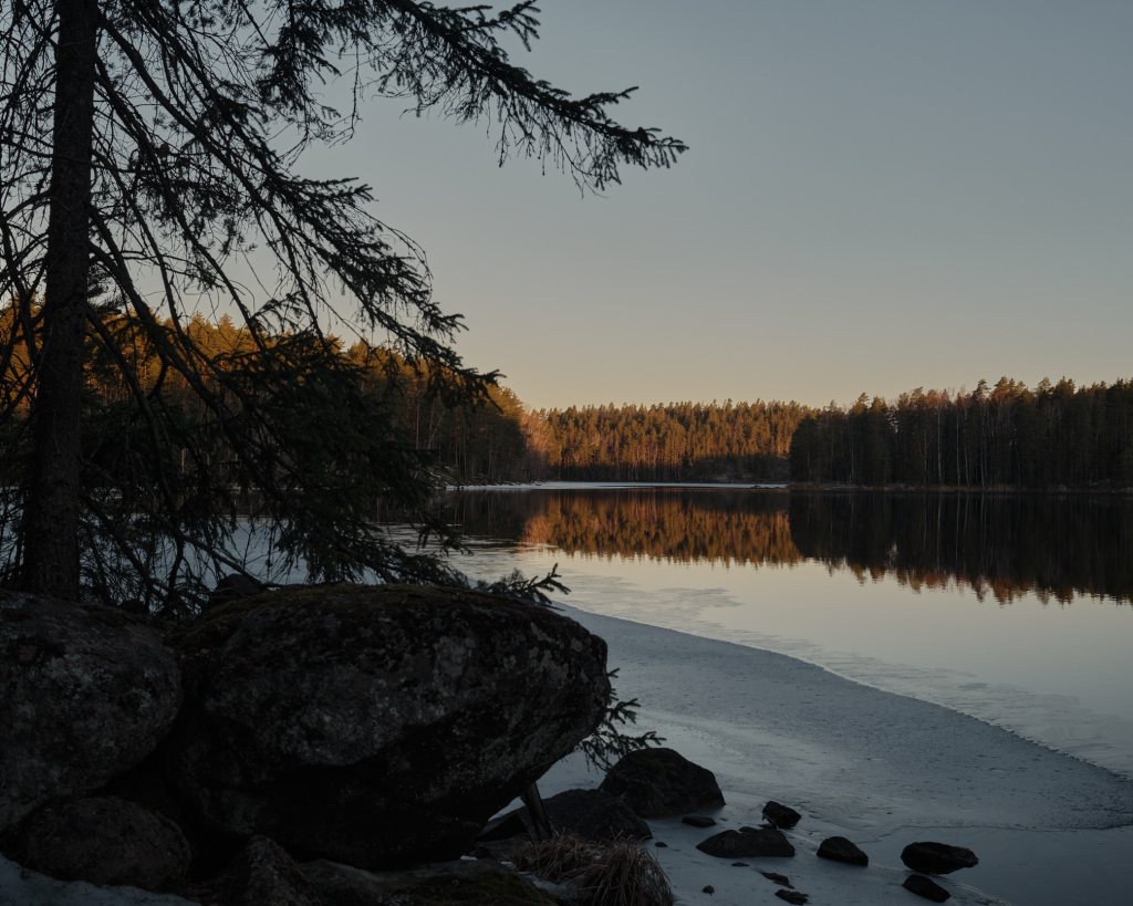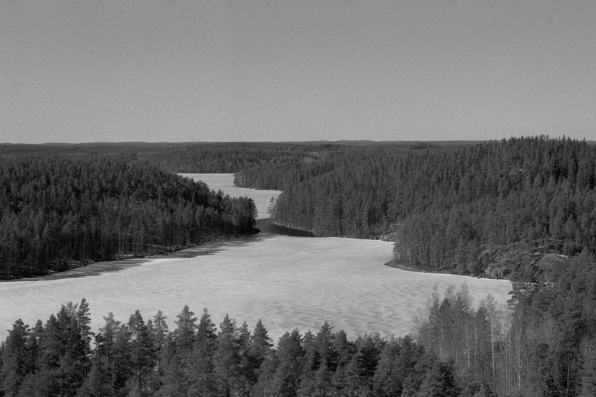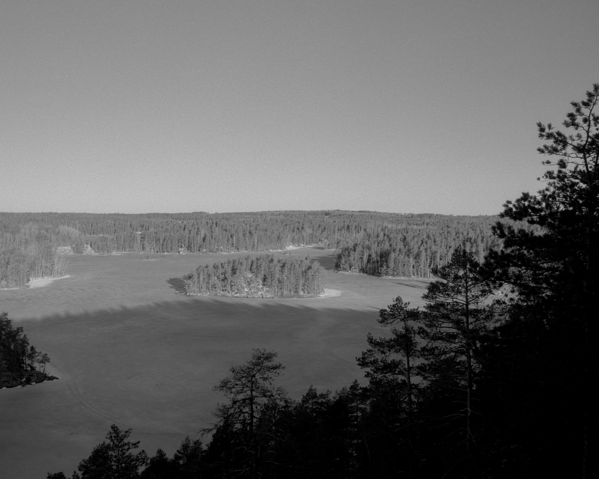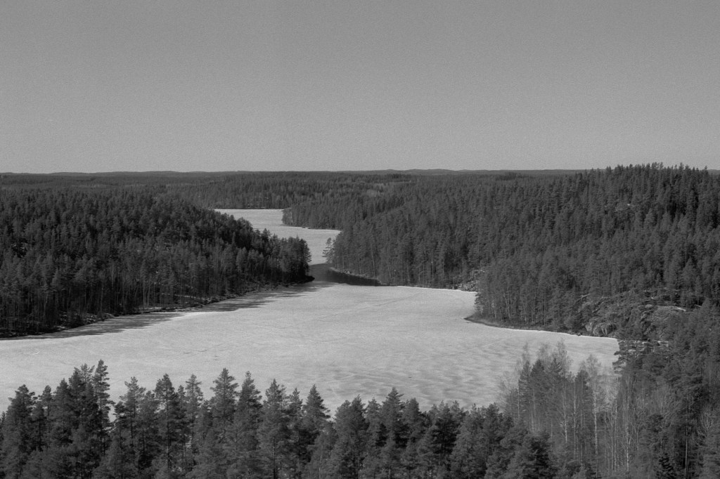 The Repovesi national park is an area of small lakes and hills near the Repovesi Lake. I had to move from my apartment for a few weeks to the city of Kouvola, which is near Repovesi. While in Kouvola, I decided to go see how Repovesi looked in spring and to take some pictures there. Many of the lakes were still partially frozen and snow covered the ground in places that were in shadow. The color pictures are taken with a digital camera, while the black-and-white pictures area taken with a film camera.