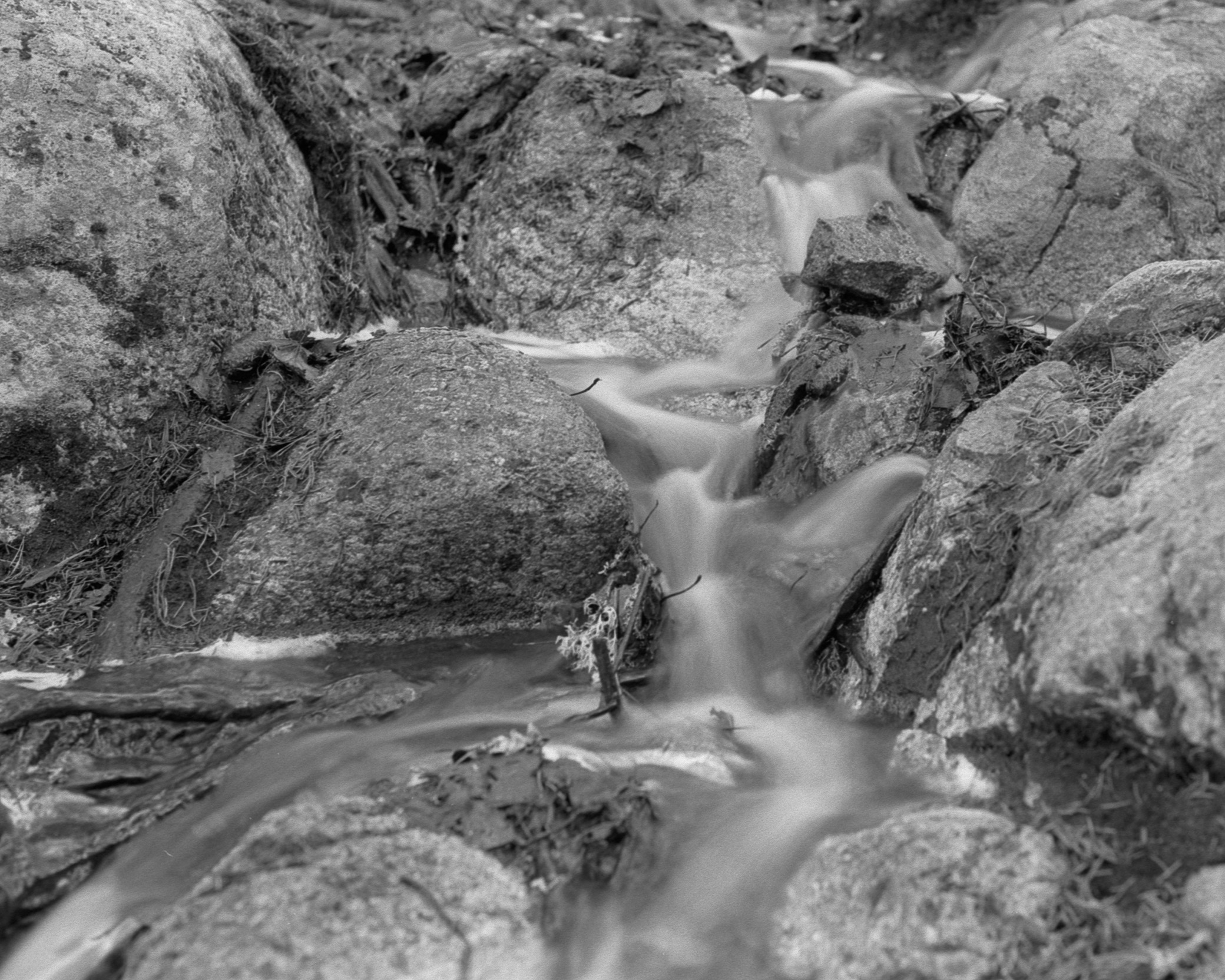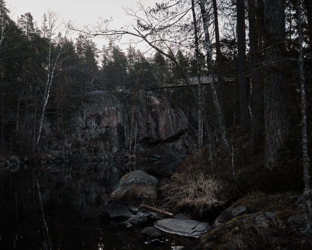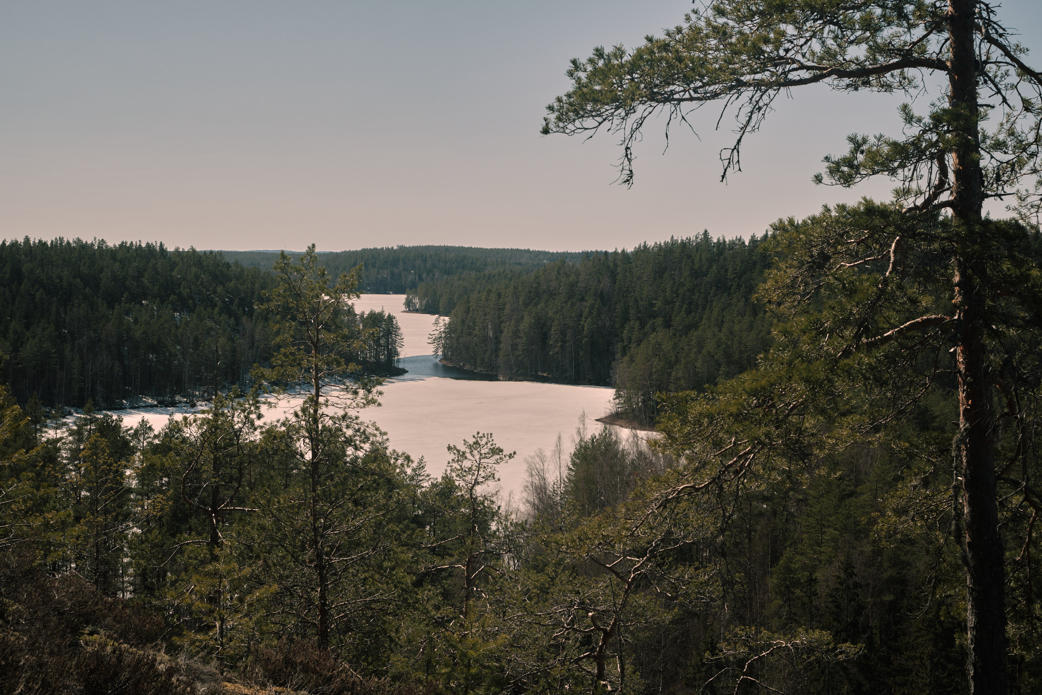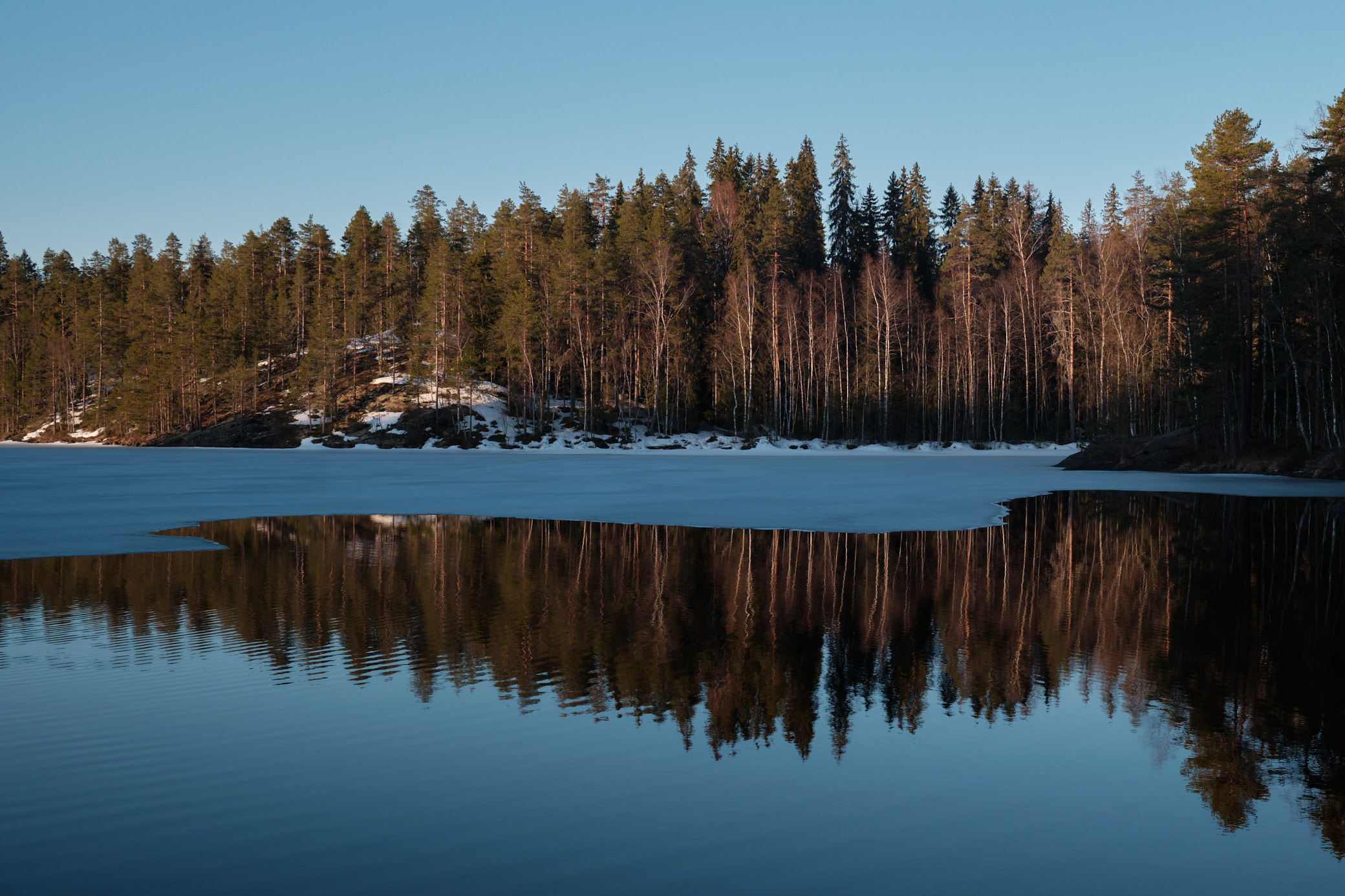The Repovesi national park is an area of small lakes and hills near the Repovesi Lake. I had to move from my apartment for a few weeks to the city of Kouvola, which is near Repovesi. While in Kouvola, I decided to go see how Repovesi looked in spring and to take some pictures there. Many of the lakes were still partially frozen and snow covered the ground in places that were in shadow. The color pictures are taken with a digital camera, while the black-and-white pictures area taken with a film camera.