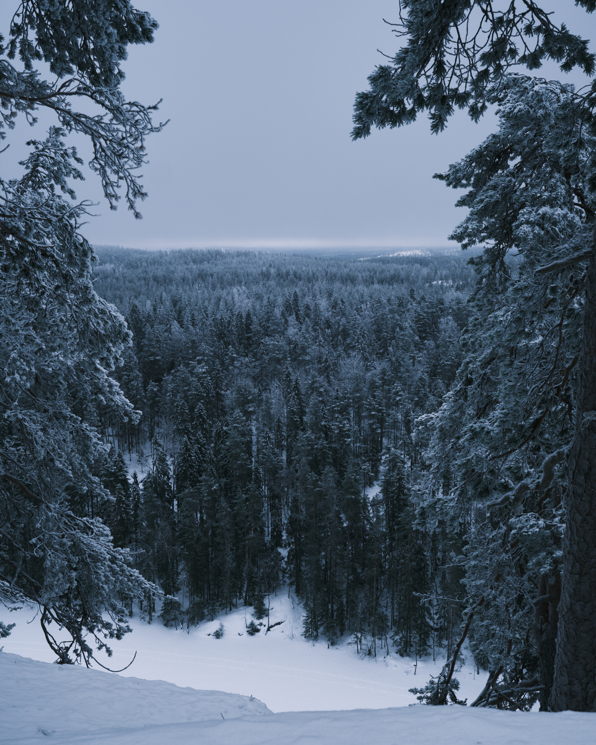 During this winter, I visited the Etelä-Konnevesi national park in central Finland. There is a 19 km long path through the whole park, but I only went through a shorter 5 km path. I went there in the evening and was expecting to at least get some nice pictures of sunset from the top of a large hill in the park, but it turned out that there were very thick clouds and the sun was not visible at all.