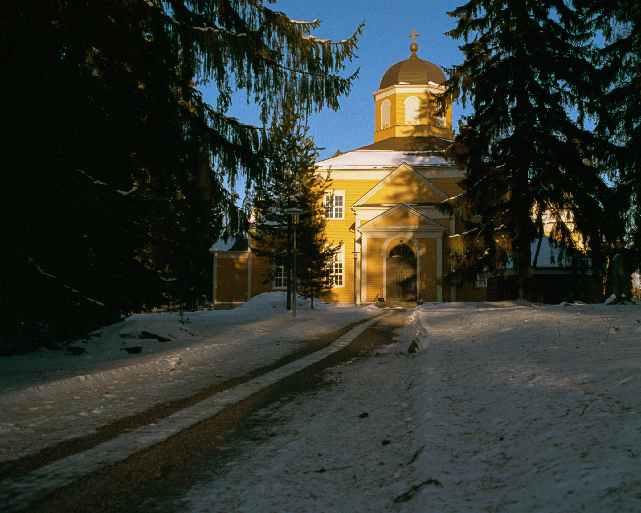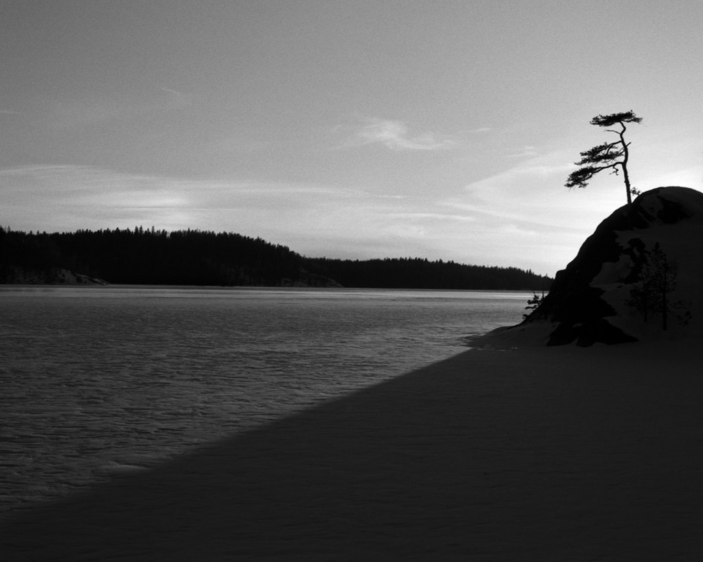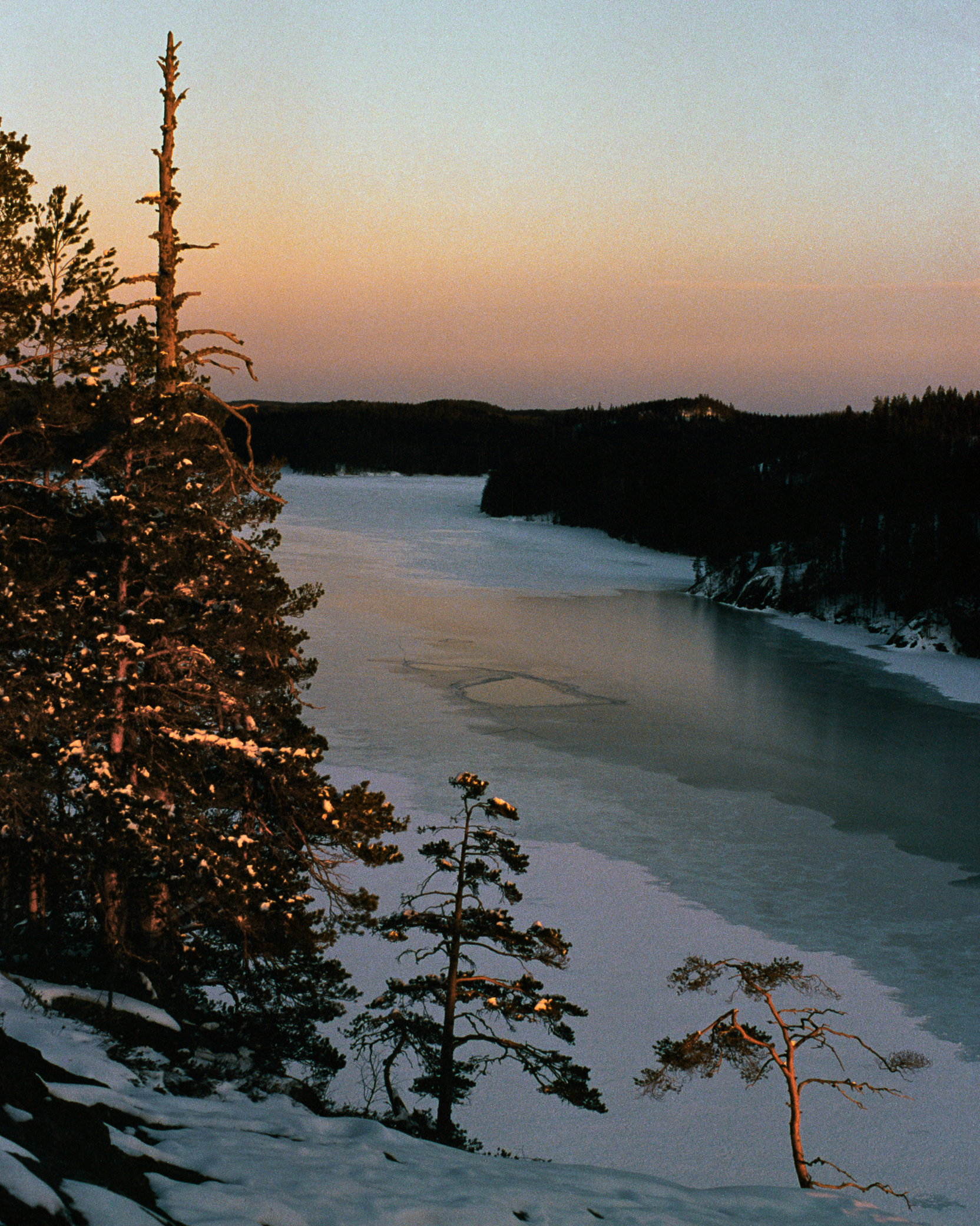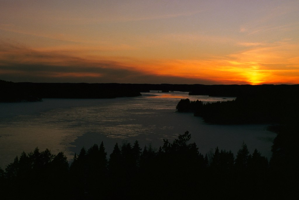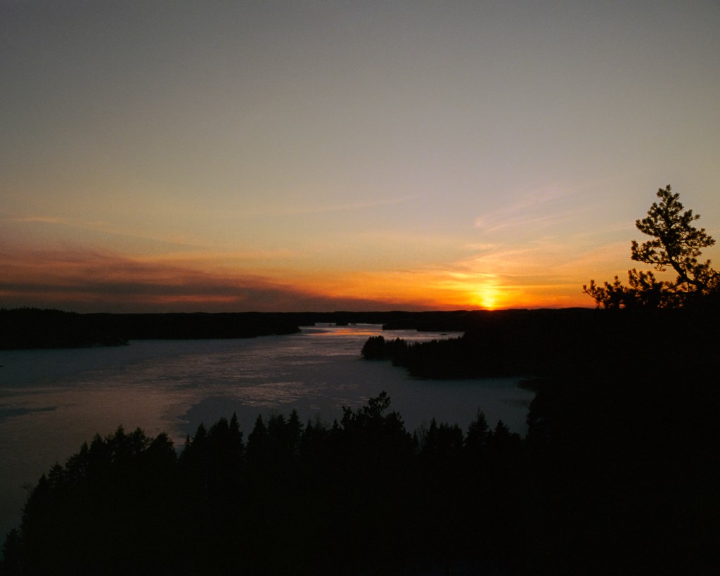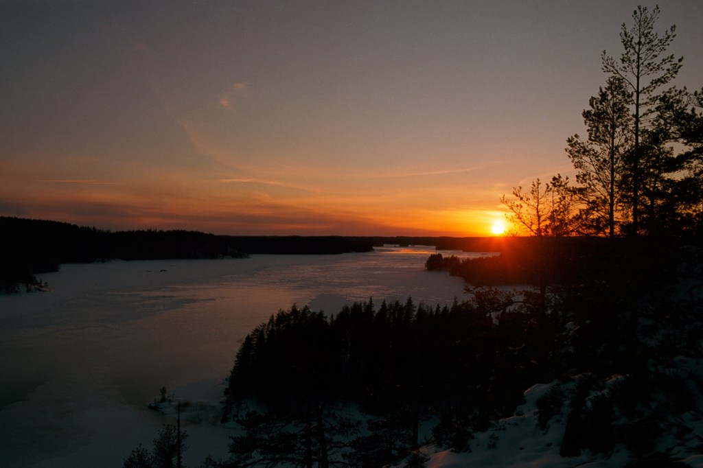 A short nature trail near the town of Sulkava leads to the rocky coast of the Enonvesi lake. I took these pictures from the town and from the coast during late winter in the evening. The trail was covered in snow and looked liked it had not been used much. It was difficult to walk through, but the view of the sunrise from the coast worth it.